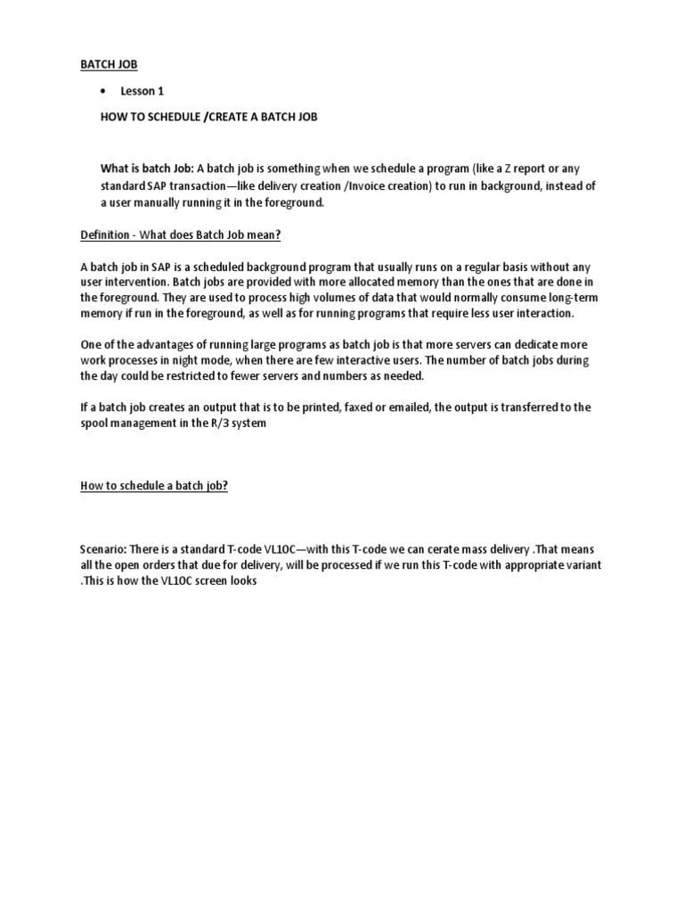 - Automation: Batch jobs can be scheduled to run automatically, reducing the need for manual intervention.